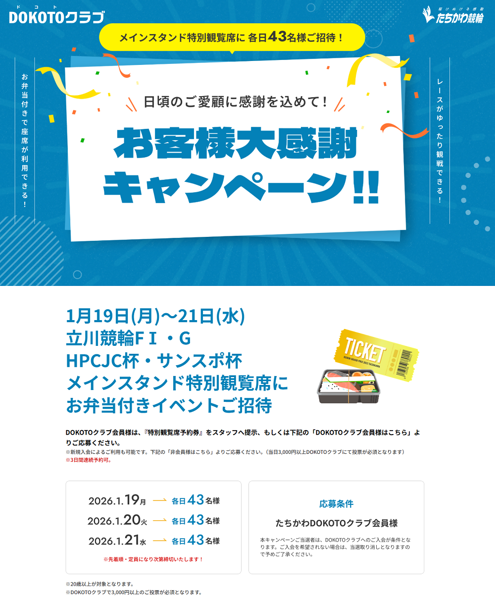 1月19日(月)~21日(水) にDOKOTOクラブ会員限定でメインスタンド特別観覧席お弁当付きご招待&ガラポン抽選会を実施いたします。