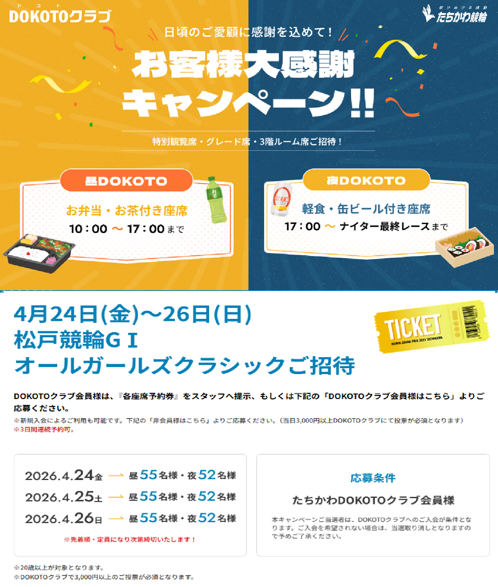 ※4月24日(金)~4月26日(日)の期間、DOKOTOクラブでは松戸オールガールズクラシック(GI)最終レースまで発売します。