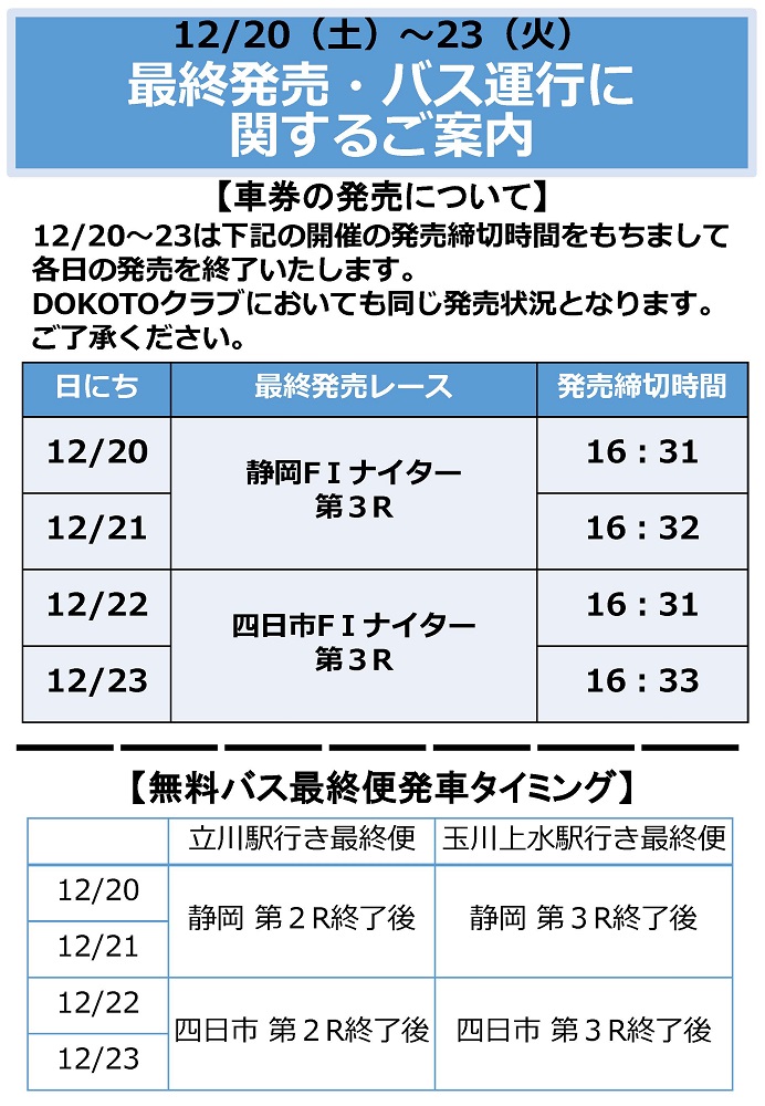 Informationニュース Home お知らせ・イベント:ニュース一覧 12月20日~23日 最終発売・バス運行に関するご案内 Xでポスト Facebookでシェア 2025年12月17日 (水) アーカイブ 2025年12月 2025年11月 2025年10月 2025年9月 2025年8月 2025年7月 2025年6月 2025年5月 2025年4月 2025年3月 2025年2月 2025年1月 2024年12月 2024年11月 2024年10月 2024年9月 2024年8月 2024年7月 2024年6月 2024年5月 2024年4月 2024年3月 2024年2月 2024年1月 2023年12月 2023年11月 2023年10月 2023年9月 2023年8月 2023年7月 2023年6月 2023年5月 2023年4月 2023年3月 2023年2月 2023年1月 2022年12月 2022年11月 2022年10月 2022年9月 2022年8月 2022年7月 2022年6月 2022年5月 2022年4月 2022年3月 2022年2月 2022年1月 2021年12月 2021年11月 2021年10月 2021年9月 2021年8月 2021年7月 2021年6月 2021年5月 2021年4月 2021年3月 2021年2月 2021年1月 2020年12月