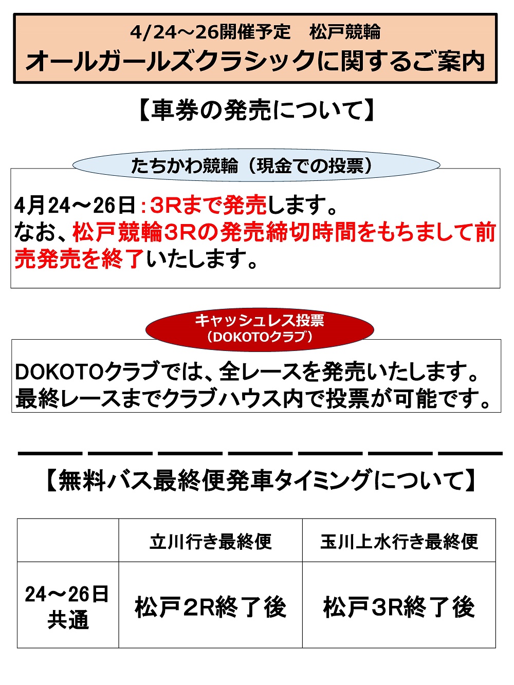 Informationニュース Home お知らせ・イベント:ニュース一覧 2026年4月 5月1日~6日 平塚GI日本選手権発売・バス運行に関するご案内 2026年4月17日 (金) 4月24日~26日 松戸オールガールズクラシックナイター発売・バス運行に関するご案内 アーカイブ 2026年4月 2026年3月 2026年2月 2026年1月 2025年12月 2025年11月 2025年10月 2025年9月 2025年8月 2025年7月 2025年6月 2025年5月 2025年4月 2025年3月 2025年2月 2025年1月 2024年12月 2024年11月 2024年10月 2024年9月 2024年8月 2024年7月 2024年6月 2024年5月 2024年4月 2024年3月 2024年2月 2024年1月 2023年12月 2023年11月 2023年10月 2023年9月 2023年8月 2023年7月 2023年6月 2023年5月 2023年4月 2023年3月 2023年2月 2023年1月 2022年12月 2022年11月 2022年10月 2022年9月 2022年8月 2022年7月 2022年6月 2022年5月 2022年4月 2022年3月 2022年2月 2022年1月 2021年12月 2021年11月 2021年10月 2021年9月 2021年8月 2021年7月 2021年6月 2021年5月 2021年4月 2021年3月 2021年2月 2021年1月 2020年12月
